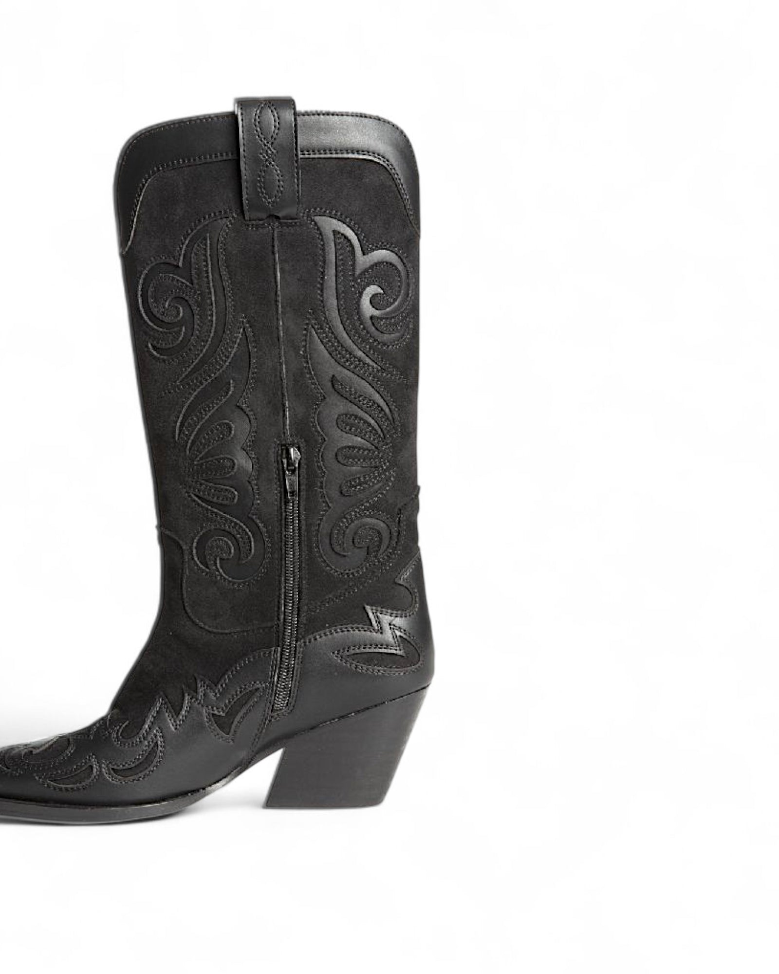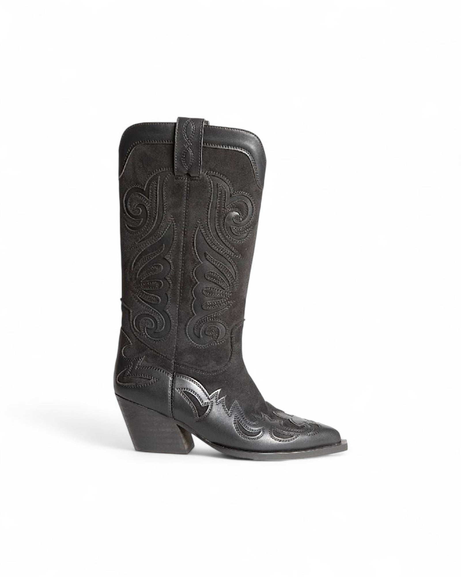 Estas botas Corina em pele e camurça vegan destacam-se pelo estilo cowboy, com bordados recortados e visual totalmente preto. O pequeno fecho lateral facilita o calçar sem comprometer o design. Um modelo com personalidade para quem gosta de marcar presença.