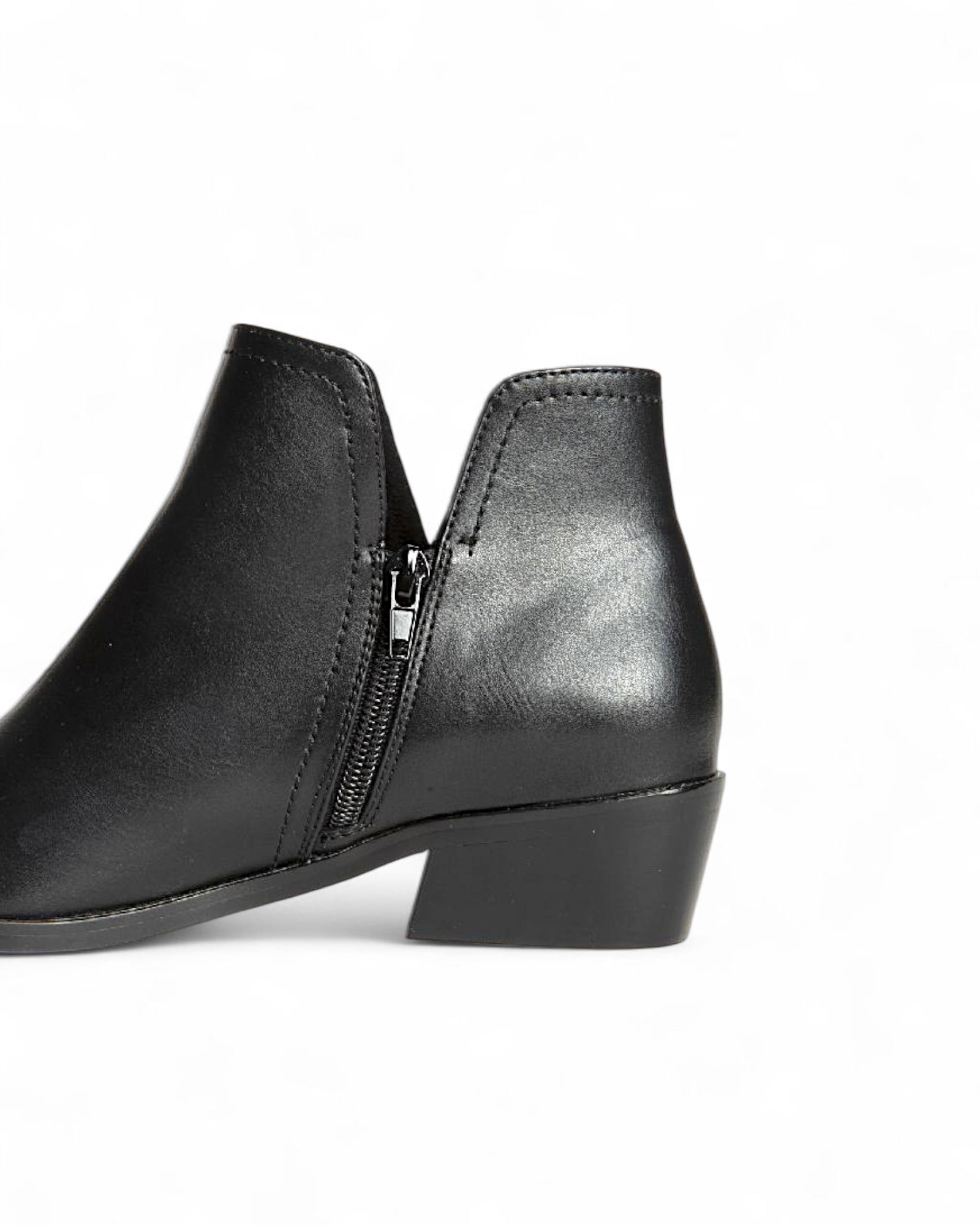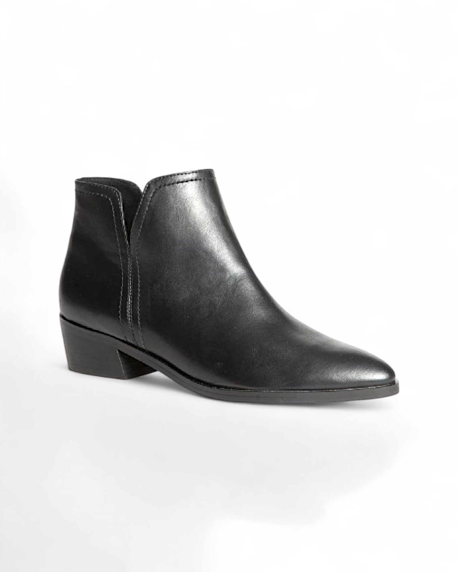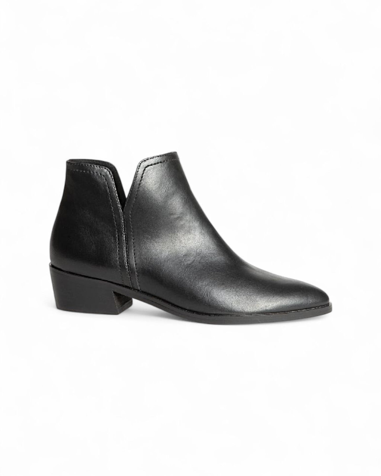 Botins Corina em pele vegan com design elegante e bico ligeiramente afilado. A abertura em V e o fecho lateral tornam o modelo prático e atual, enquanto o salto baixo garante conforto para todos os dias. Uma escolha versátil para looks modernos e intemporais.
