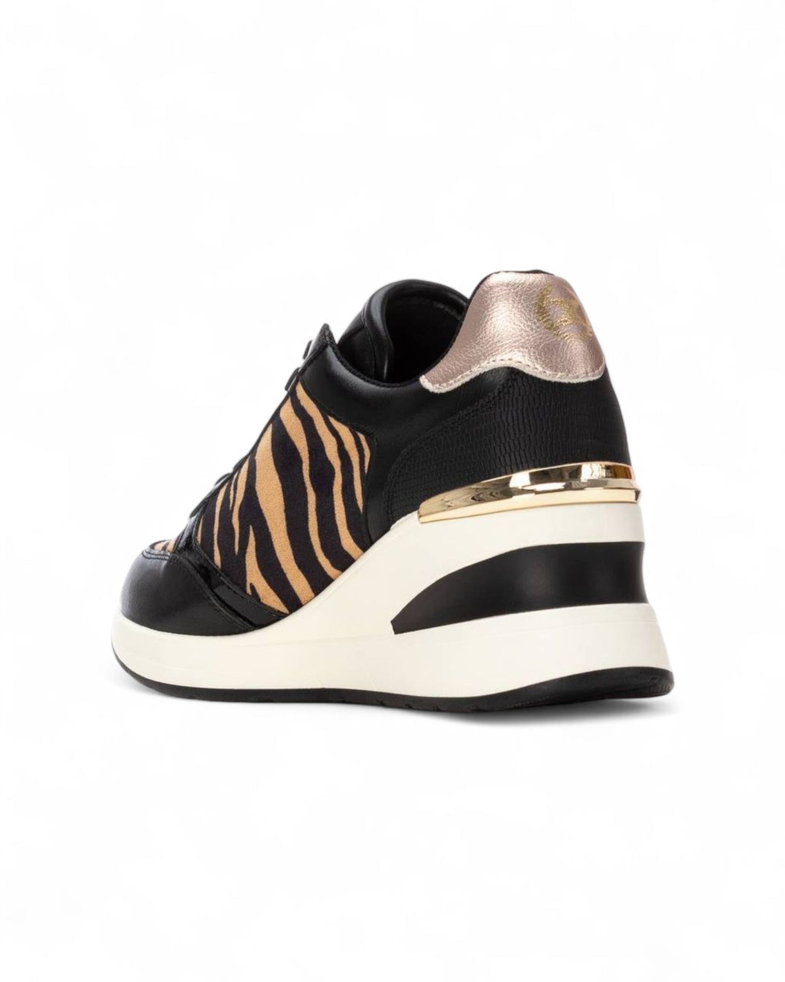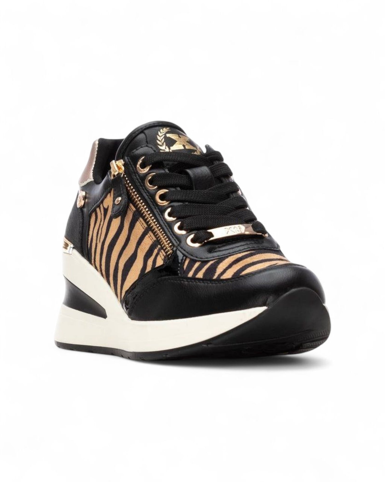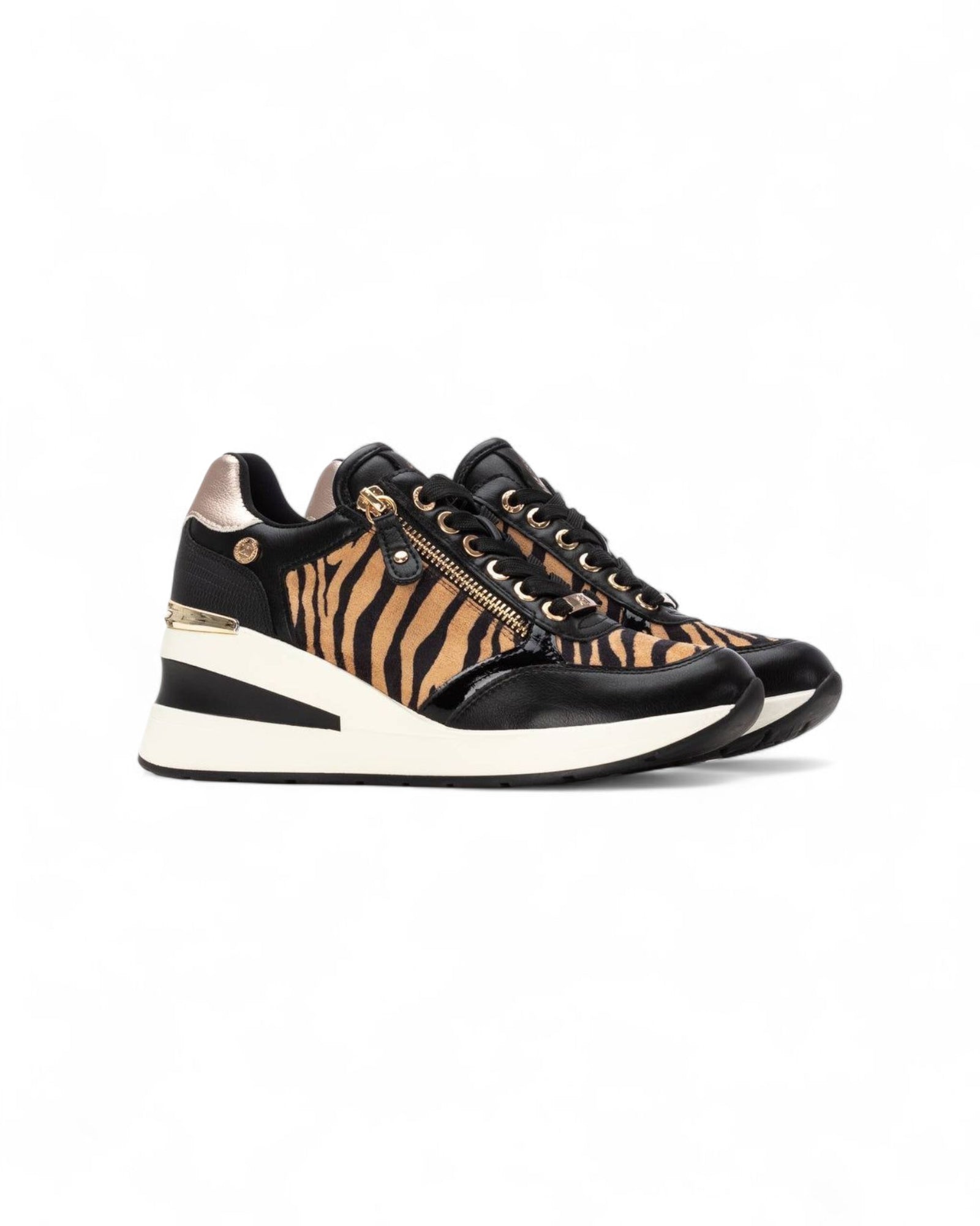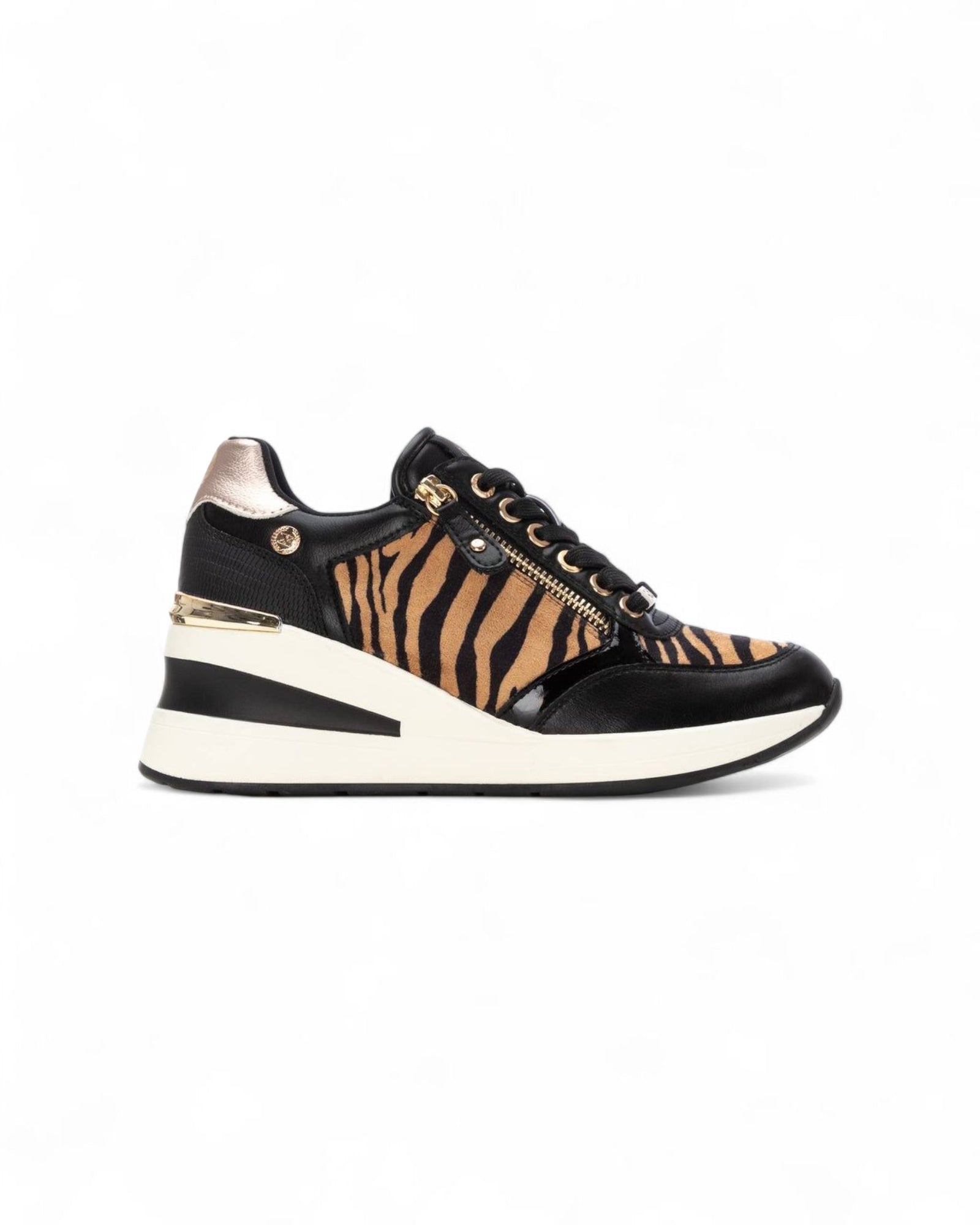 Estas sapatilhas Xti em pele e camurça vegan destacam-se pelo design moderno com padrão animal de zebra e detalhes metálicos que reforçam o estilo urbano. A sola com ligeira plataforma oferece altura extra e conforto para o dia a dia.