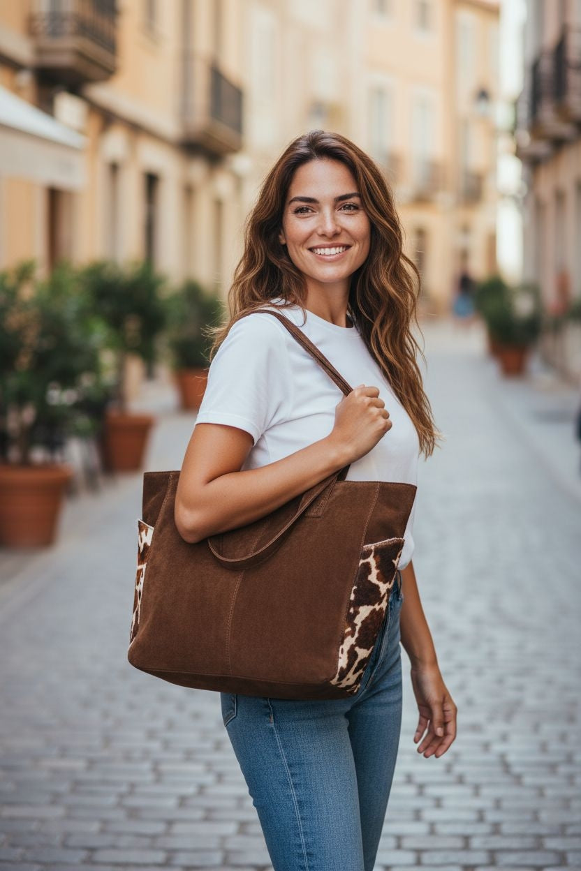 Mala de ombro em camurça com alças em pele, a fechar com zipper. Interior forrado em têxtil e dois bolsos laterais em pêlo com fecho de mola, combinando praticidade com um estilo elegante.