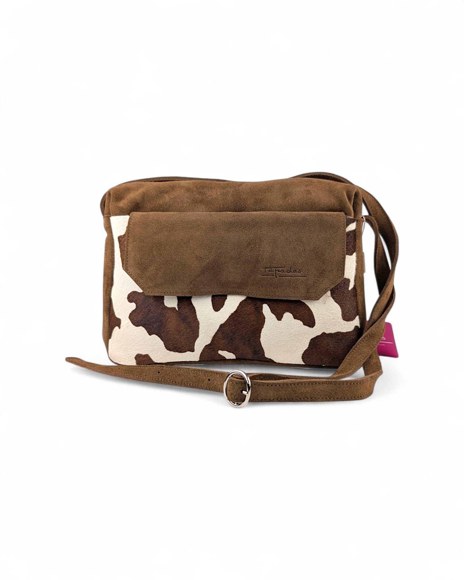 Mala a tiracolo em camurça, com bolso de pala em pêlo animal print. Fecha com zip. Bolso de pala a fechar com mola. Alça regulável com fivela. Interior em forro têxtil, com dois bolsos dos quais um a fechar com zip.