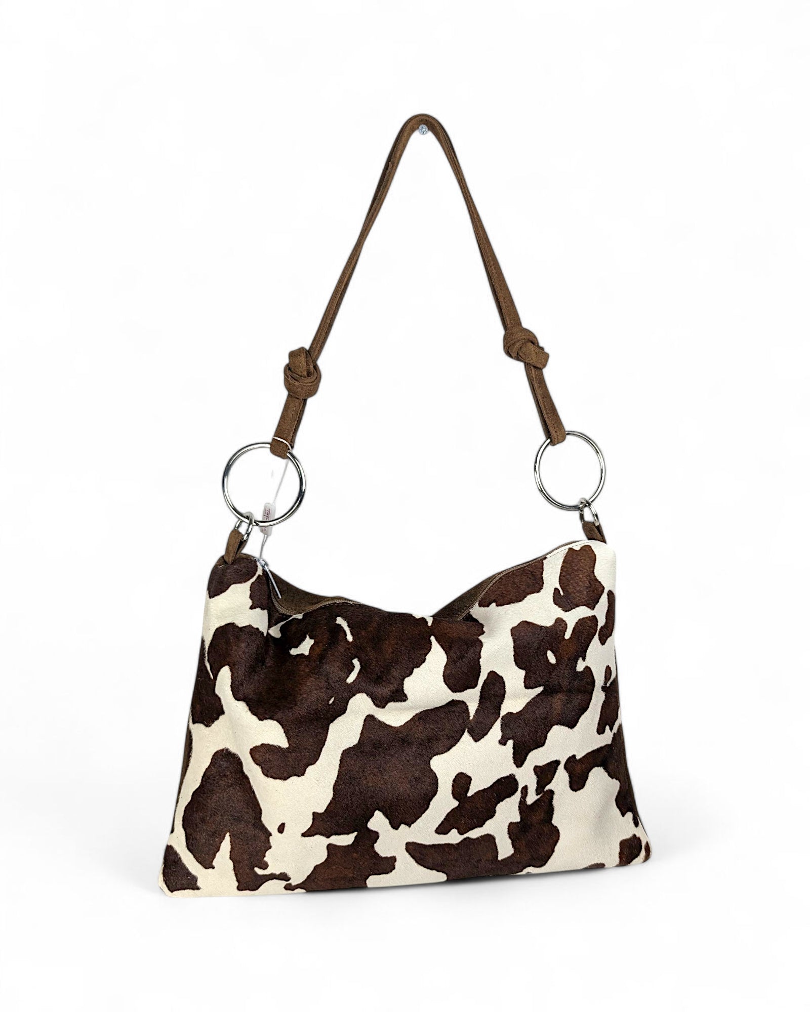 Mala de ombro em pêlo com padrão animal, a fechar com zip. Interior forrado em têxtil e alça com argolas metálicas, combinando estilo moderno e funcionalidade.
