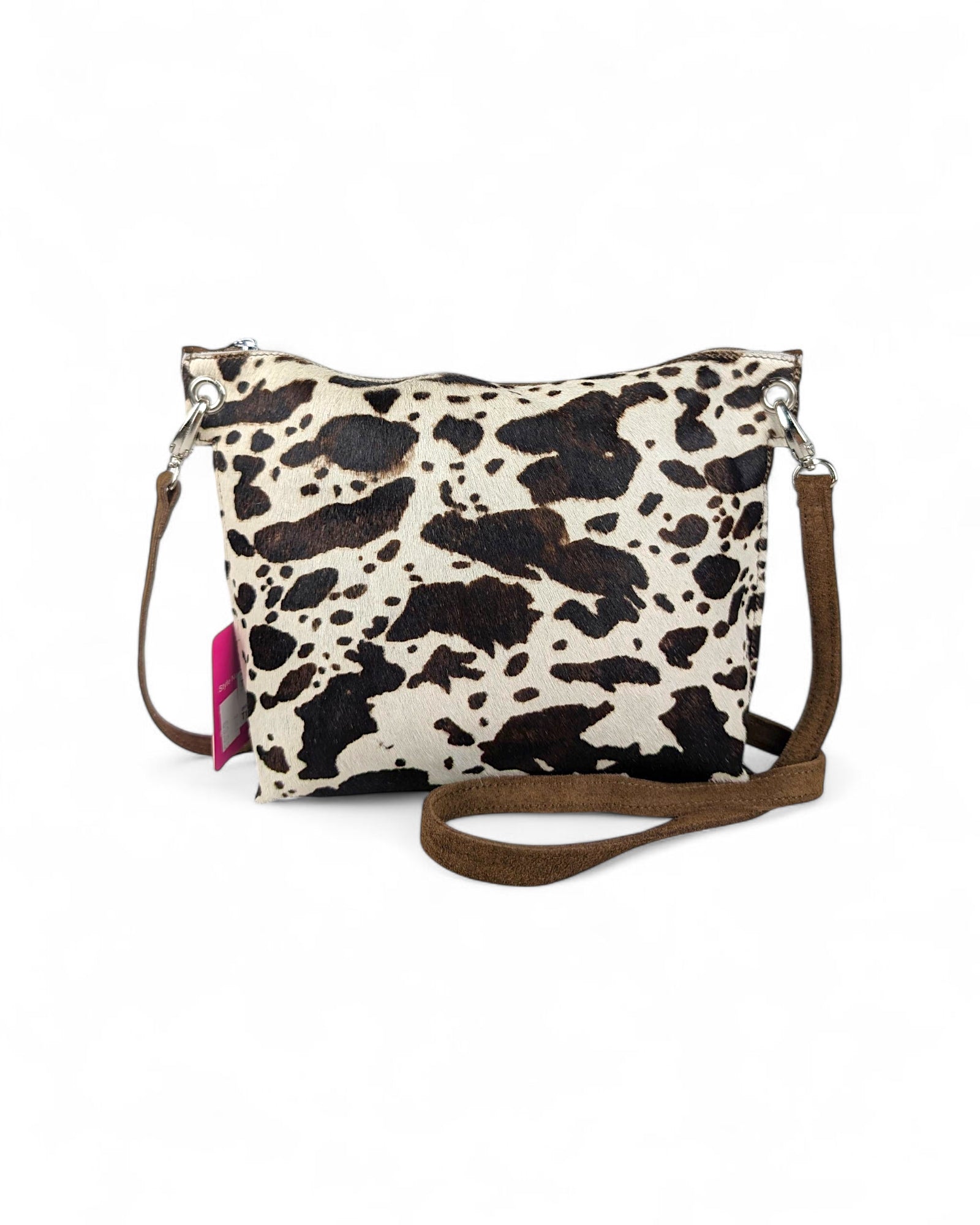 Mala tiracolo em pêlo com padrão animal, a fechar com zip. Interior forrado em têxtil e alça ajustável com fivela e argolas metálicas, unindo praticidade e estilo moderno.