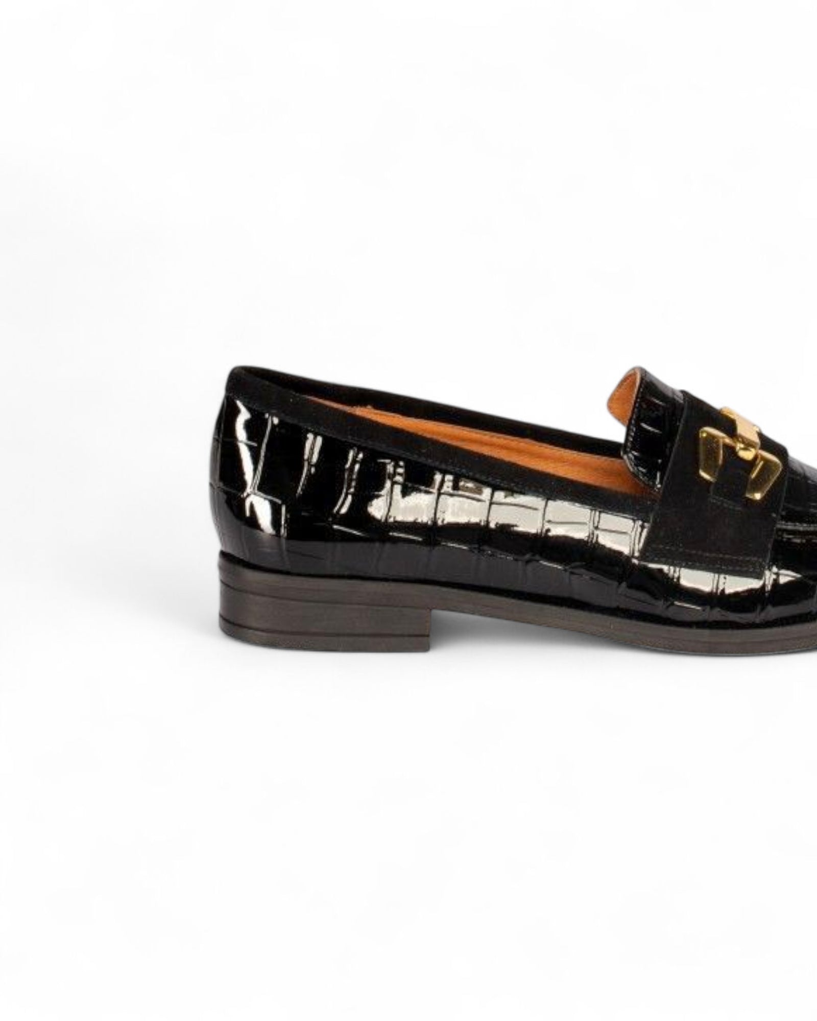 Em pele verniz com textura croco, este mocassim fabricado em Portugal destaca-se pelo design elegante com aplicação metálica dourada. Um modelo versátil para dar um toque sofisticado aos looks do dia a dia.
