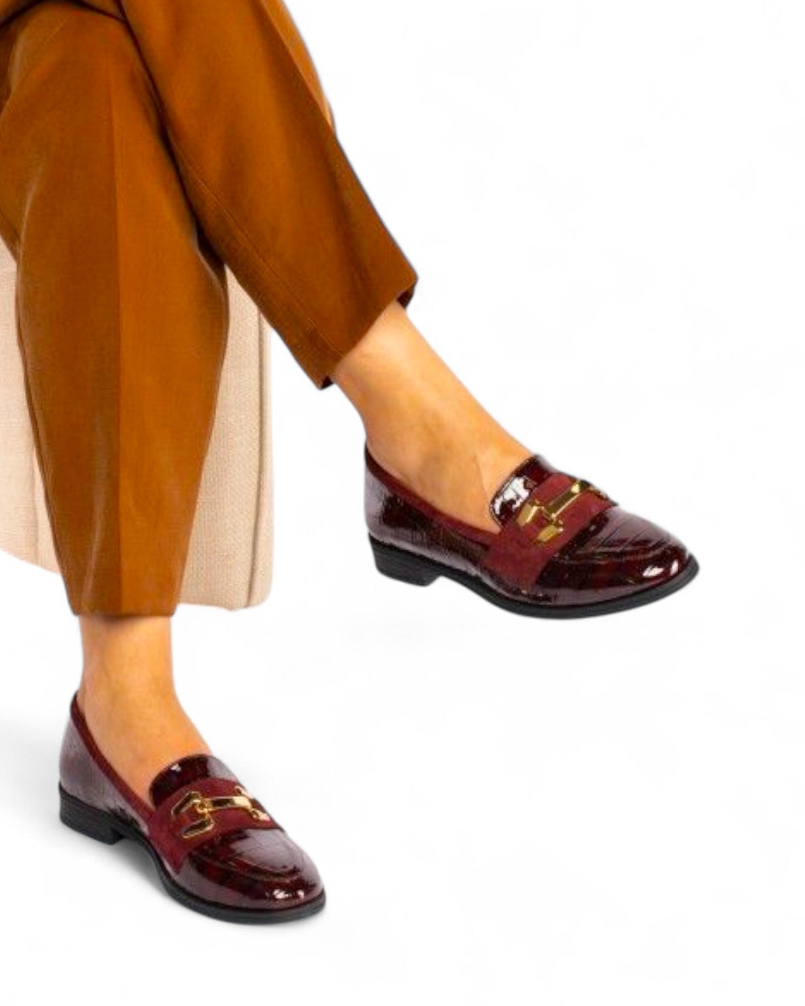 Em pele verniz com textura croco, este mocassim fabricado em Portugal destaca-se pelo design elegante com aplicação metálica dourada. Um modelo versátil para dar um toque sofisticado aos looks do dia a dia.