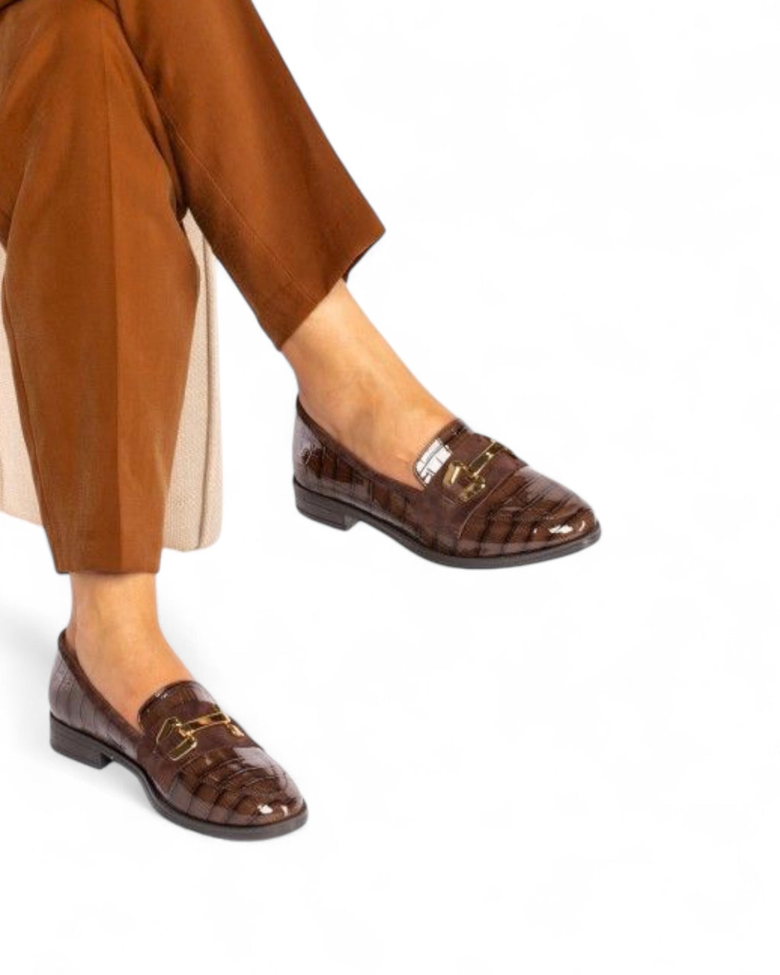 Em pele verniz com textura croco, este mocassim fabricado em Portugal destaca-se pelo design elegante com aplicação metálica dourada. Um modelo versátil para dar um toque sofisticado aos looks do dia a dia.