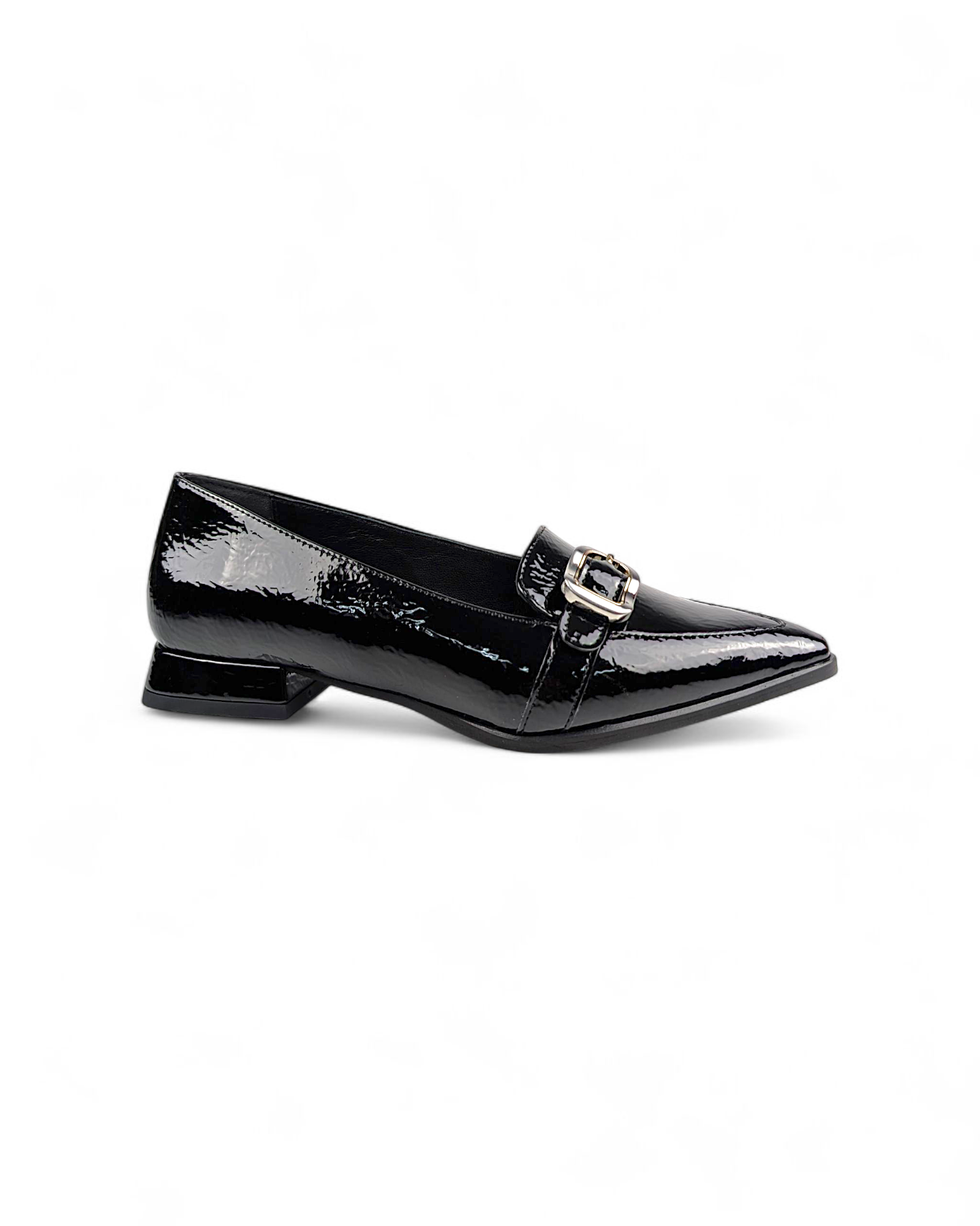 Com um design elegante em pele verniz, estes sapatos destacam-se pela fivela metálica que valoriza a tira frontal. O bico fino e o salto baixo conferem um equilíbrio perfeito entre sofisticação e conforto, ideais para um estilo clássico com modernidade.