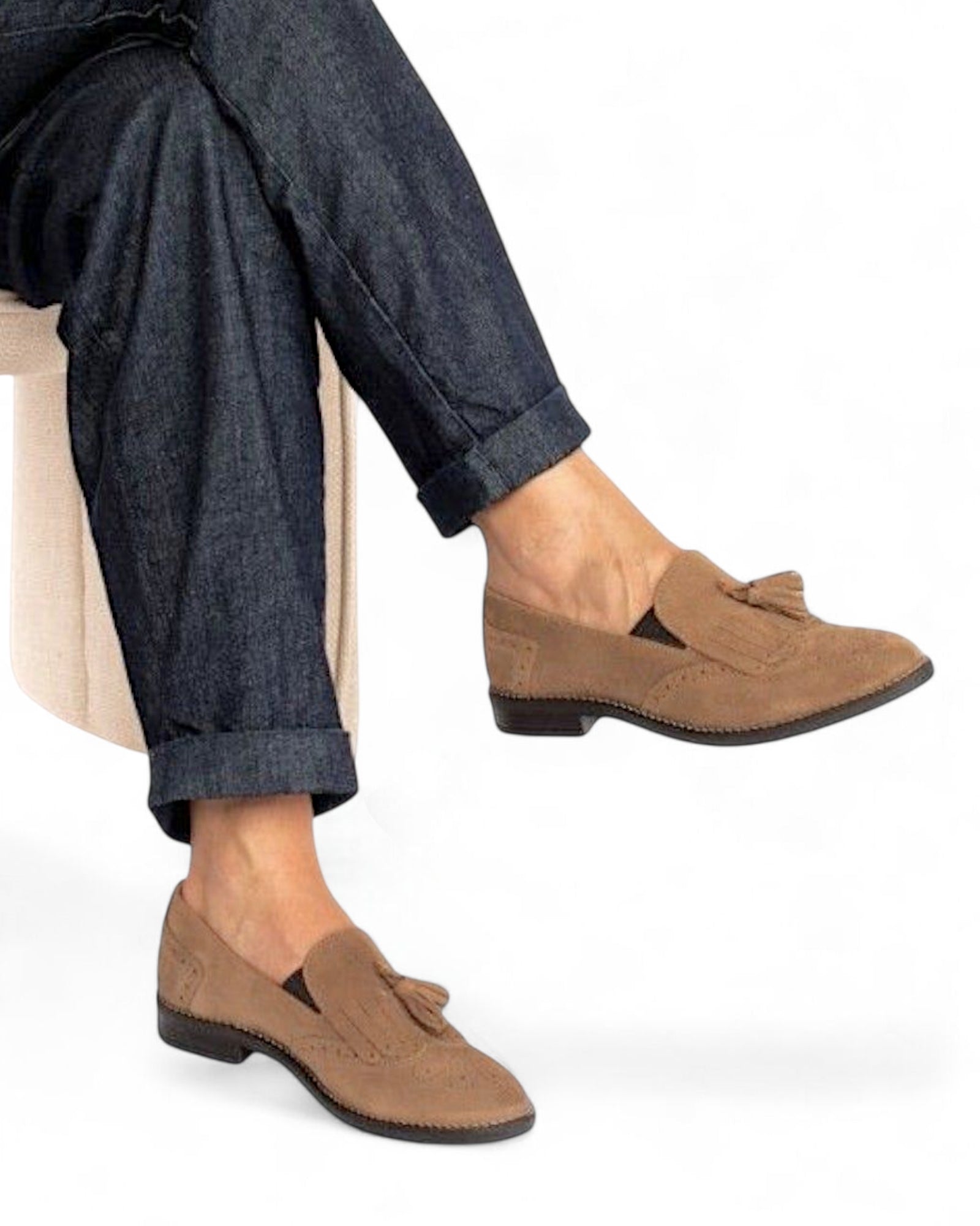 Estes loafers Tapadas em camurça/pele destacam-se pelo design clássico com franjas e picotado estilo inglês, que acrescenta sofisticação e caráter ao modelo. Uma escolha versátil que alia elegância e conforto em qualquer ocasião.